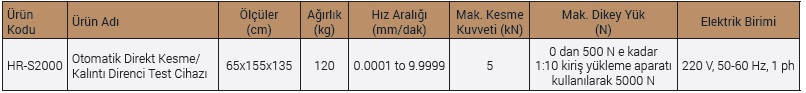Cihaz, Kesme Kutuları ile 60 mm ve 100 mm kare, ∅ 60 mm yuvarlak, ∅ 100 mm yuvarlak ve ∅ 2,5” yuvarlak numuneleri test edebilmektedir. Kesme Kutusu Takımı 1 adet Kesme Kutusu, Yükleme Başlığı, Oluklu Taban Plakası, 2 adet Poroz Taş, 1 adet Düz Izgara Plaka, 2 adet Delikli Izgara Plaka ve özel bilgisayar yazılımı ile birlikte verilmektedir. 50 kg Ağırlık Seti, Cihaz ile birlikte verilmektedir.