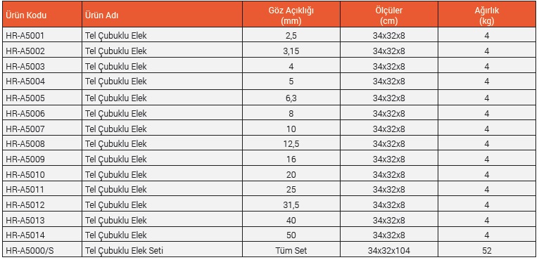 50 mm göz açıklıklı Tel Çubuklu Elek, set içerisine dahil edilmemiştir ve ayrıca sipariş edilmelidir.