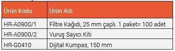 Testi yapmak için bir ölçüm cihazı (0.01 mm hassasiyetle dijital kumpas) ve 25 mm çaplı Filtre Kağıdı gerekmektedir ve ayrıca sipariş edilmelidir.