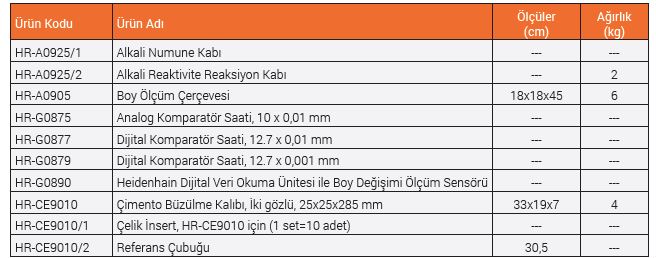 Alkali Reaktivite Reaksiyon Kabı, Alkali Numune Kabı, Boy Ölçüm Çerçevesi, Analog veya Dijital Komparatör Saati veya Heidenhain Dijital Veri Okuma Ünitesi ile ölçüm çerçevesine bağlanan 30x0,0001 mm okunabilirlikte Boy Değişimi Ölçüm Sensör, İki gözlü, 25x25x285 mm Çimento Büzülme Kalıbı, Çelik İnsertler ve Referans Çubuğu ayrıca sipariş edilmelidir.