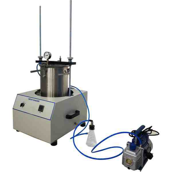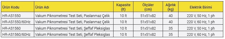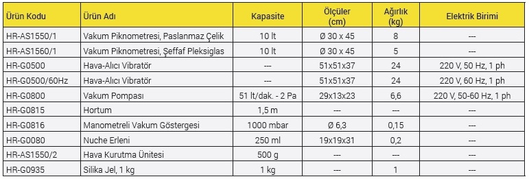 Vakum Piknometresi, Hava-Alıcı Vibratör, Vakum Pompası, Vakum için 1,5 m Hortum, Manometreli Vakum Göstergesi ve 250 ml Erlenmayer ile birlikte verilmektedir.